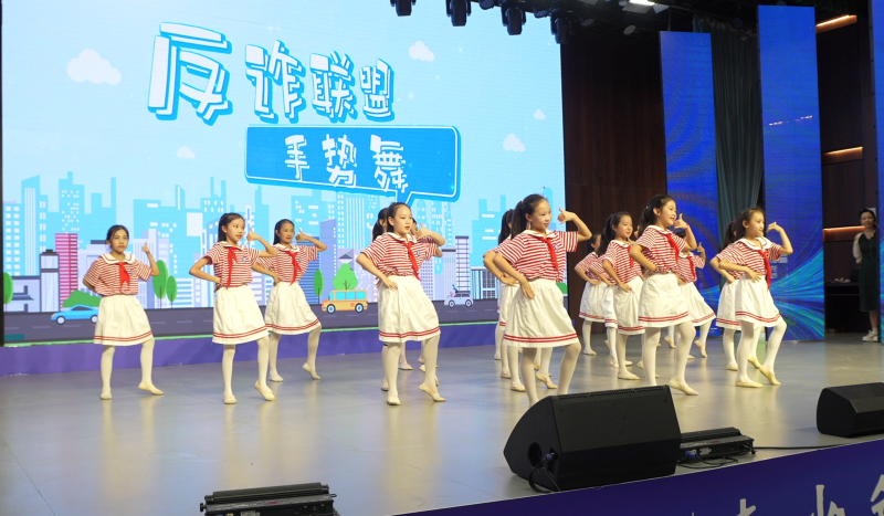 在轻松欢快的音乐声中,手势舞《反诈联盟舞蹈》精彩上演,通过学生喜闻乐见的形式,普及网络安全知识,引导和培育青少年网络安全意识、文明素养、行为习惯和防护技能,营造安全、健康、文明的网络环境。