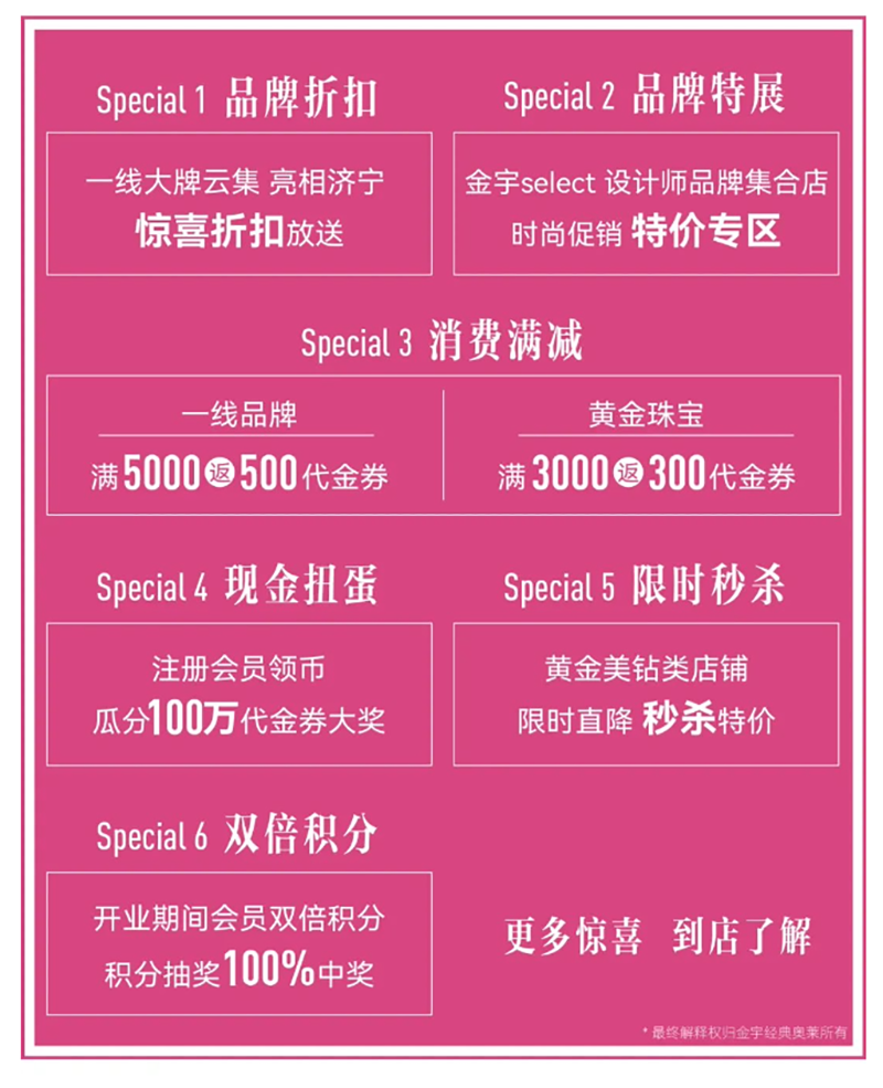 隨著金宇經(jīng)典奧萊的開業(yè),濟(jì)寧國際生活節(jié)正式拉開序幕。以回饋濟(jì)寧人為目的,制造濟(jì)寧人自己的時尚地盤,4.29-5.30盛惠不止狂歡不停,覆蓋五一黃金周,推出大量優(yōu)惠活動,時尚秀場、live演出、驚喜折扣、雙倍積分、現(xiàn)金扭蛋等,回饋廣大市民朋友!