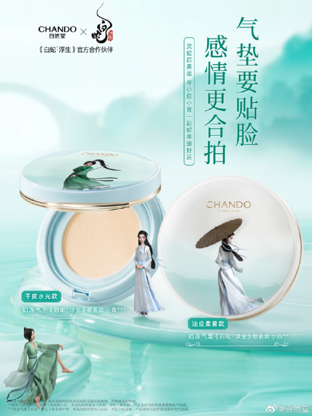 在2024年,《白蛇3:浮生》不僅打破了七夕檔期動畫電影的累計票房紀錄,而且白蛇IP還借此機會與金石盟珠寶、北京一卡通、YHD羊很大、芬蘭珠寶FEO等眾多品牌合作推出聯(lián)名產(chǎn)品。隨著蛇年營銷活動的啟動,《白蛇3:浮生》迎來了聯(lián)名產(chǎn)品的“第二春”。自然堂與《白蛇3:浮生》的聯(lián)名款氣墊推出后,緊接著“自然堂蛇年生肖禮盒”也相繼問世。