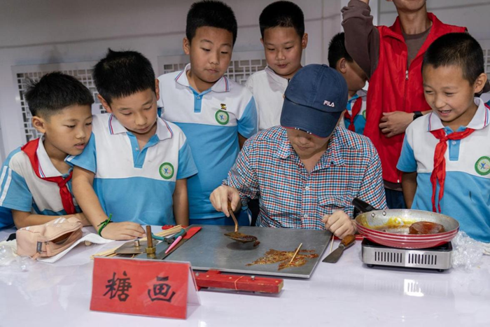 9月26日,在天津市传统文化研学基地,志愿者正在给小朋友们演示糖画制作的传统技艺。新华网 钟奕 摄